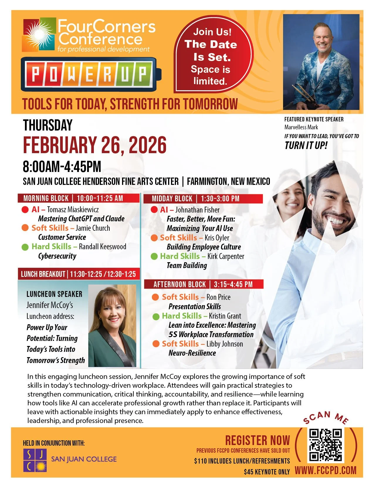 Don’t miss keynote speaker Marvelles Mark as he turns up the volume and brings high energy to this year’s conference! REGISTER NOW! FULL CONFERENCE KEYNOTE ONLY Thanks to our Sponsors! Pinon Level Presenting - $5,000 San Juan County Commission Cedar Level - $2,000 Juniper Level - $1,000 Aspen Level - $500